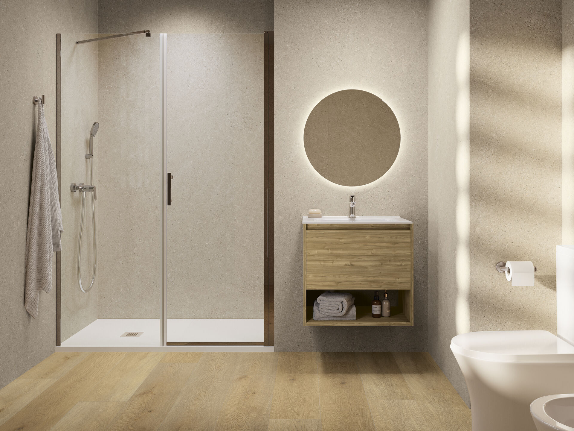 The Frame model combines lines with the warmth of its finishes, creating an essential and versatile bathroom furniture. Its suspended design provides visual lightness and optimises space, while the combination of Caramel laminate or gloss white lacquer evokes a serene and contemporary atmosphere. The practical drawer together with its open bottom shelf offer storage solutions to keep everything in order, without compromising on style. Perfect for projects that seek harmony between functionality and timeless beauty.
