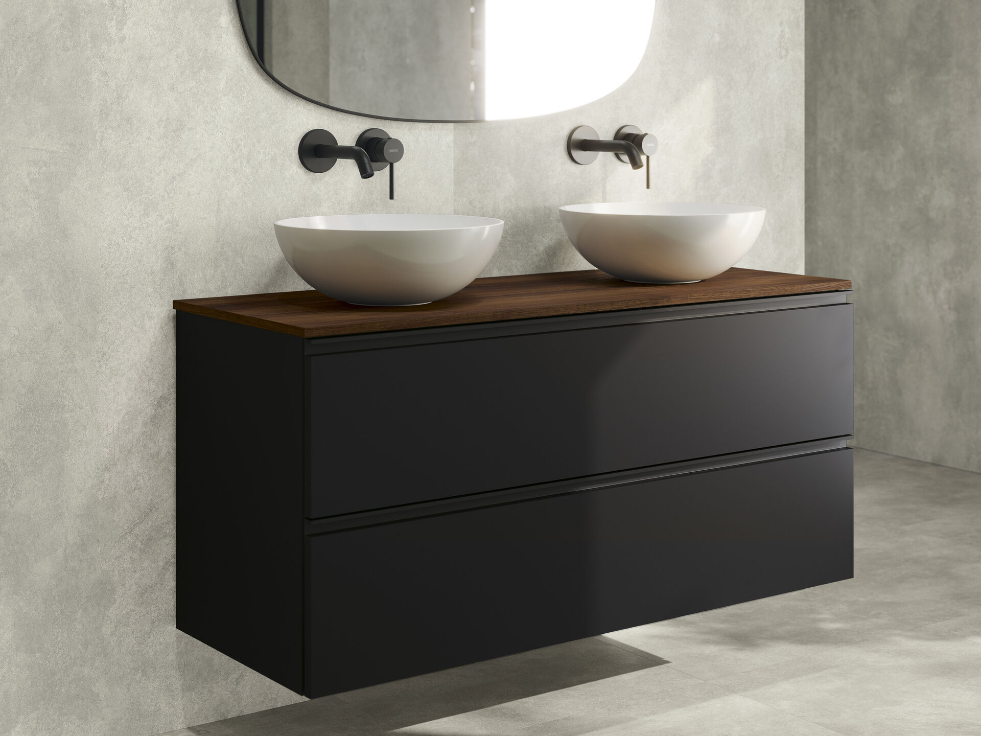 Tempus combines the warmth of wood with contemporary lines, creating a versatile and timeless bathroom furniture. Its laminate finishes in natural tones and lacquered in soft or intense colors bring character to any space. With two spacious drawers and customizable countertop options, it offers a perfect solution for projects that seek design and practicality without sacrificing sophistication.