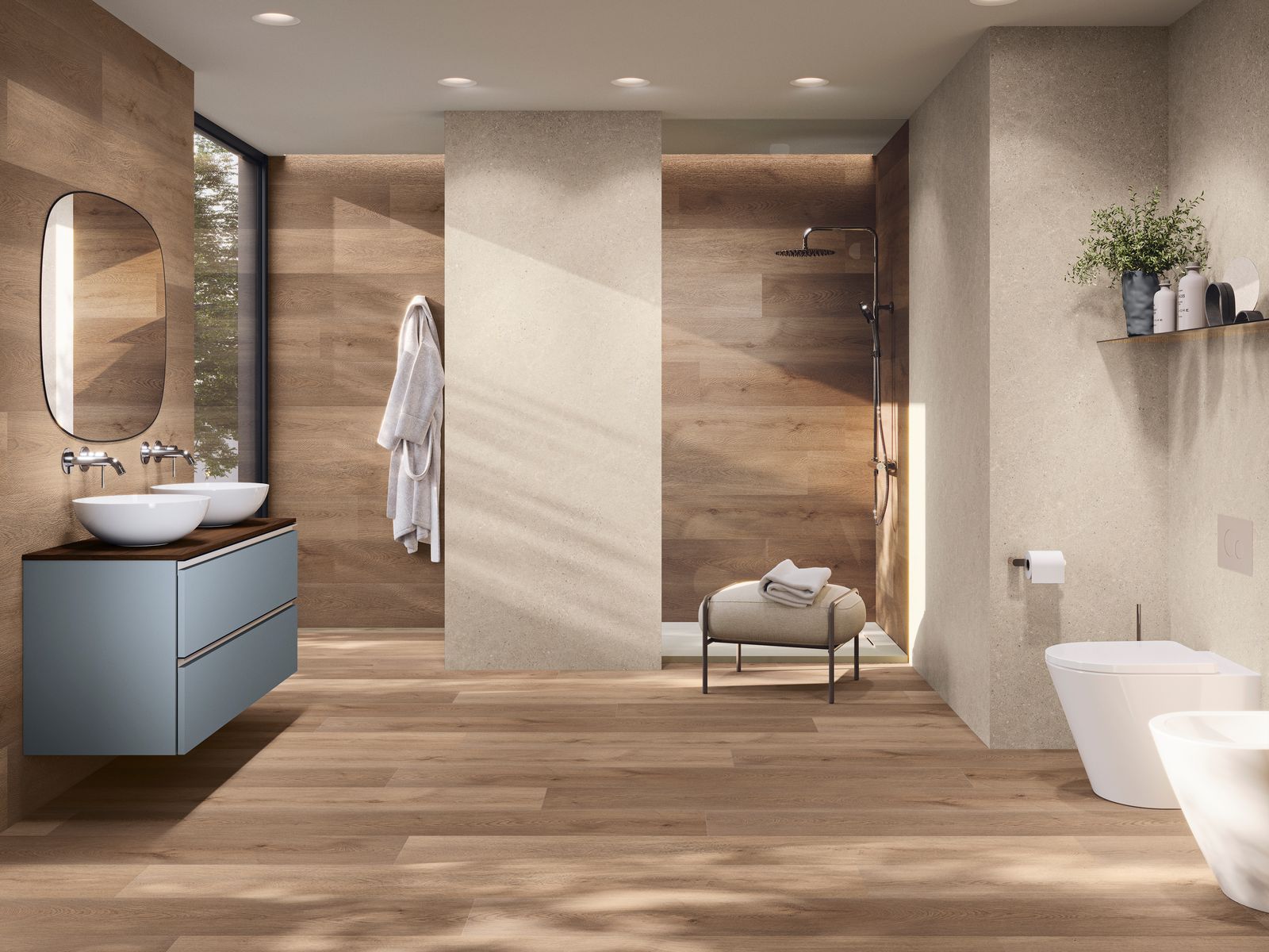 A long-lasting coating choice that fits any area, perfectly enhancing our Techstep flooring, as together they can outfit all spaces, even the most humid ones like bathrooms. Drawing inspiration from natural materials like stone and cement, it presents a hyper-realistic appearance that adds a warm and elegant feel. Its simple installation and upkeep render it perfect for residential, commercial, and office endeavors.